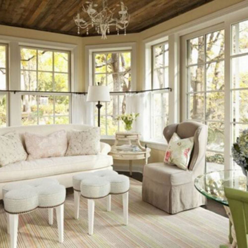 3、德高瓦頂陽光房:(優點)有德高瓦、桑拿板等五層組成的頂子隔熱、保溫好、顏色多樣外表美觀漂亮。(缺點)彩光不夠好,價格比較高;可以在頂部開天窗、四周設計高大的窗子,幫助采光通風。