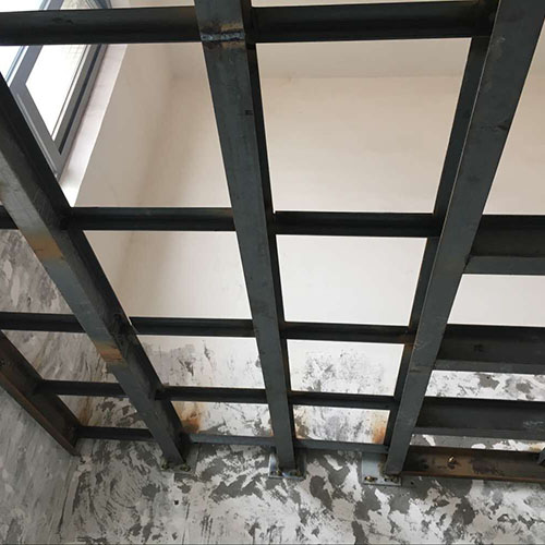 2、 解決了槽鋼的固定點,下面要解決的就是主龍骨的編排。一般對于居室來說,建議采用120×60×6mm或以上規格的槽鋼作用主龍骨。主龍骨應該與最短的一邊平行進行鋪設,間隔500mm左右。槽鋼必須架放在墻上的之上,且與墻面的空隙不超過10mm。槽鋼滿焊于橫檔之上。如果與最短的一邊平行鋪設沒有固定條件時,也可以與最長的一邊平行進行鋪設。