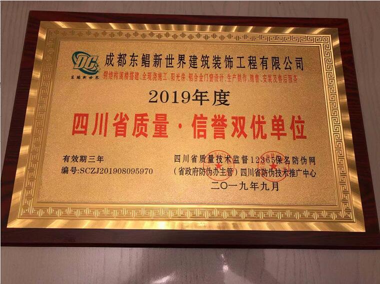 成都東鯧新世界裝飾工程有限公司榮獲2019年度四川省質量、信譽雙優單位